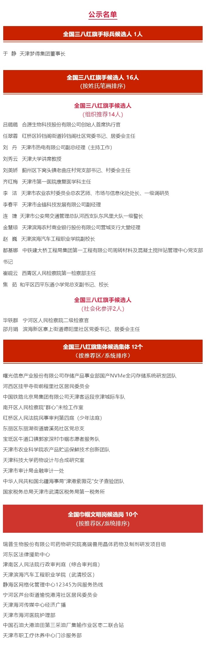 通过各区妇联、各系统组织推荐,经过资格初审、评委评审、市妇联党组会审议研究,拟向全国妇联报送我市2025年度全国三八红旗手标兵候选人1人、全国三八红旗手候选人14人、全国三八红旗集体候选集体12个、全国巾帼文明岗候选岗10个为初审推荐对象。另,按照全国妇联相关工作要求,对我市2名通过社会化途径参评2025年度全国三八红旗手且进入全国妇联初评名单的个人一并进行公示。