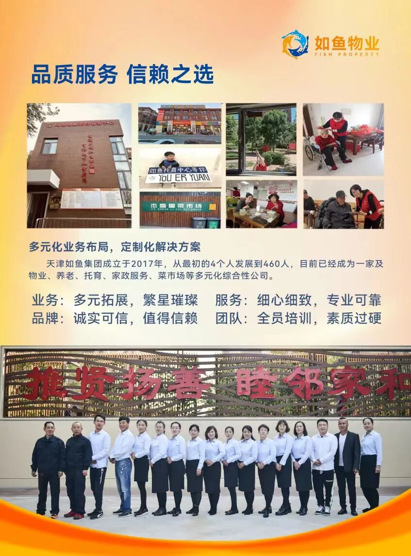 天津如鱼集团有限公司,是西青区率先实施“家政服务进社区”的试点企业,深耕家政服务领域多年,业务覆盖母婴护理、养老照护、专业保洁、整理收纳等核心板块,服务范围辐射西青区张家窝镇、津门湖街道16个社区73个小区,以“百姓是水,我们是鱼”的服务宗旨,将精细化家政服务送到居民家门口,成为社区居民信赖的“生活好帮手”。