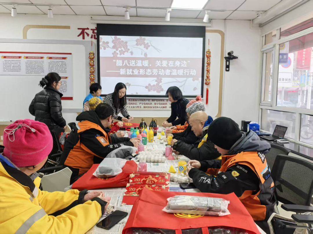 果园新村街东升里社区妇联以“腊八送温暖,关爱在身边”为主题,为新就业形态劳动者举办了一场关怀活动,不仅为奔忙在一线的网约车司机、货车司机、快递员和外卖员送上了厚实的羽绒马甲等御寒物资,更组织了一场别开生面的腊八蒜现场制作体验,让劳动者们在亲手劳作中感受传统节日的浓厚氛围。