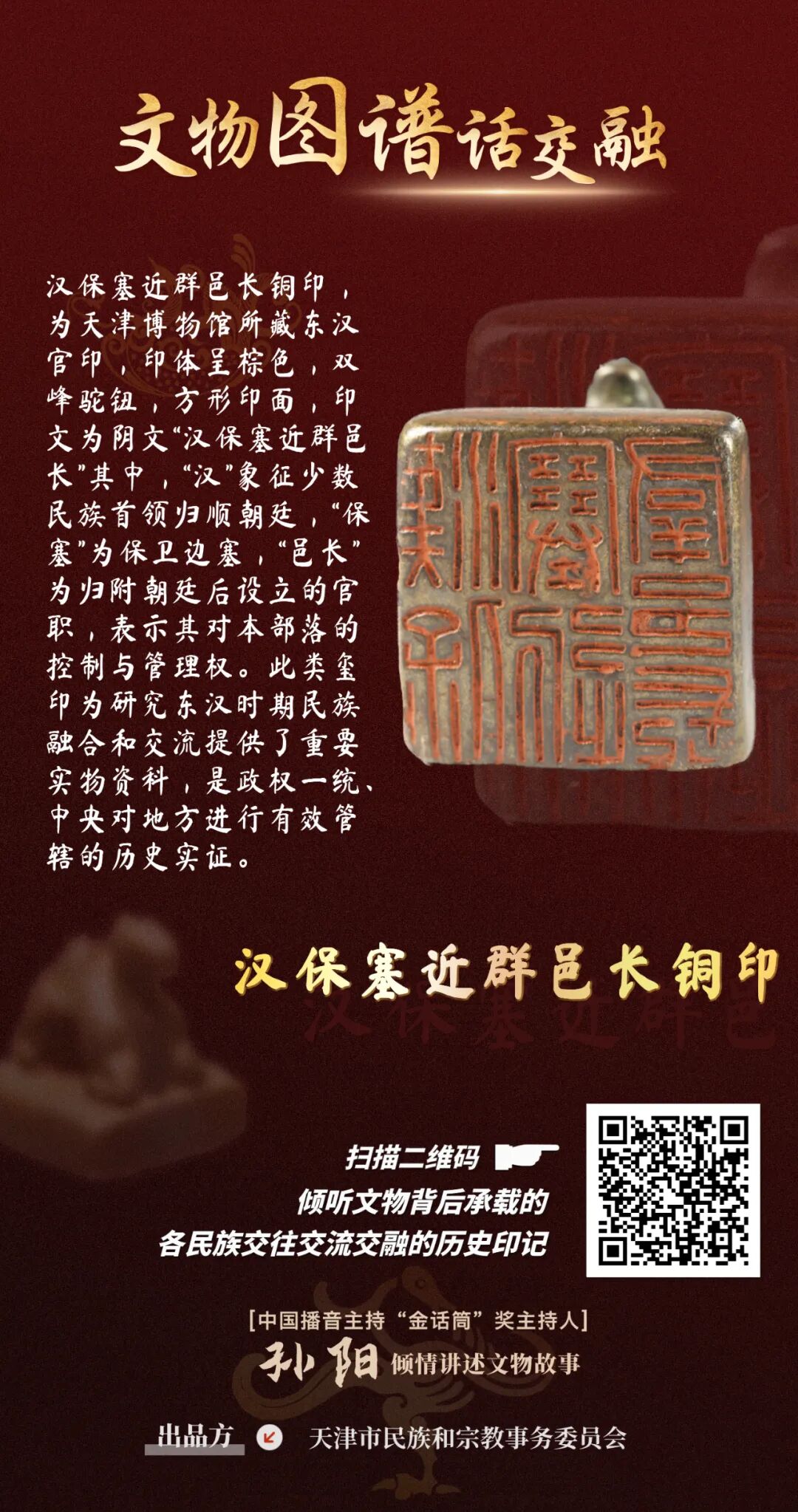 按:为进一步宣传贯彻落实习近平总书记关于加强和改进民族工作的重要思想以及习近平总书记视察天津重要讲话精神,牢牢把握新时代的文化使命,坚持以文化人、以文惠民、以文润城、以文兴业,在推动文化传承发展上善作善成,市民族宗教委紧紧把握铸牢中华民族共同体意识工作主线,从《中国民族文物图谱•天津市卷》中精选出珍贵文物,制作了23张“文物图谱话交融”为主题的有声海报,生动再现天津各民族广泛交往交流交融的历史故事。