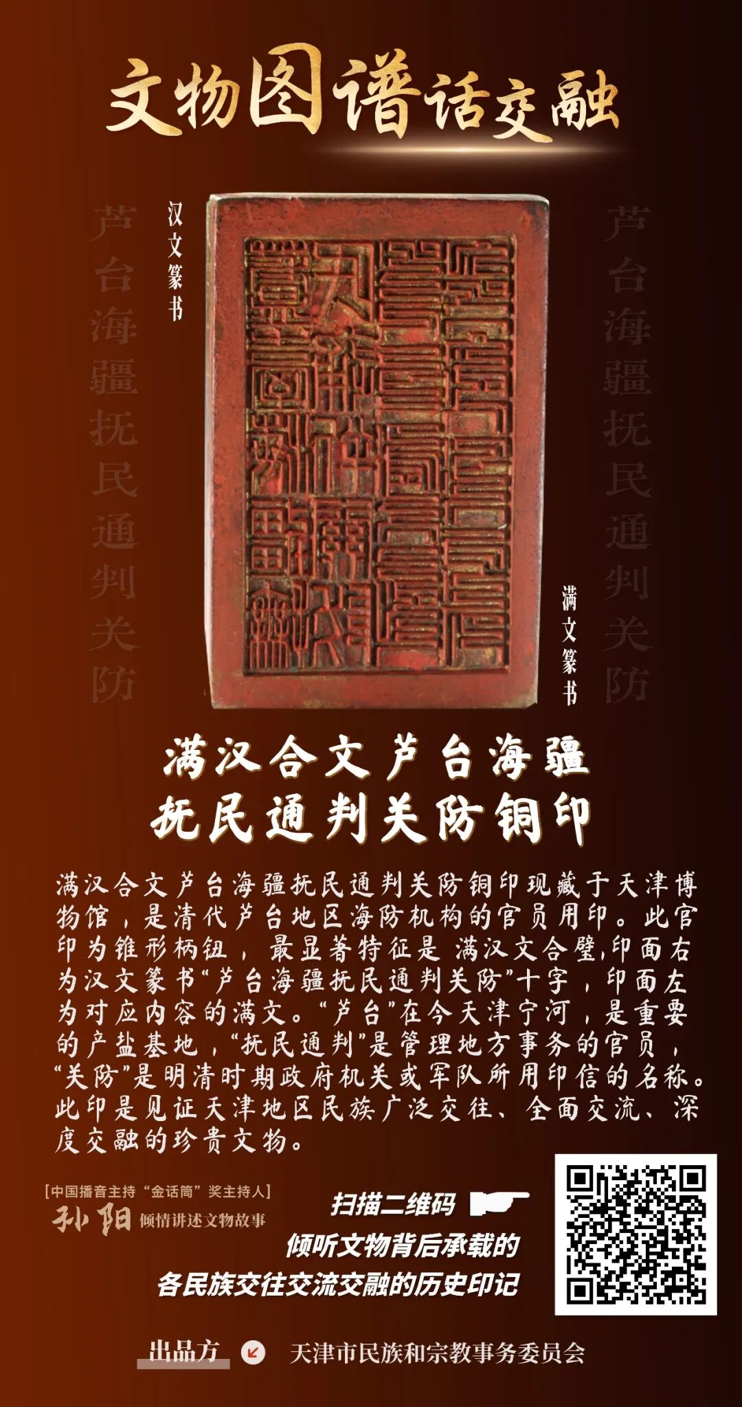 按:为进一步宣传贯彻落实习近平总书记关于加强和改进民族工作的重要思想以及习近平总书记视察天津重要讲话精神,牢牢把握新时代的文化使命,坚持以文化人、以文惠民、以文润城、以文兴业,在推动文化传承发展上善作善成,市民族宗教委紧紧把握铸牢中华民族共同体意识工作主线,从《中国民族文物图谱•天津市卷》中精选出珍贵文物,制作了23张“文物图谱话交融”为主题的有声海报,生动再现天津各民族广泛交往交流交融的历史故事。