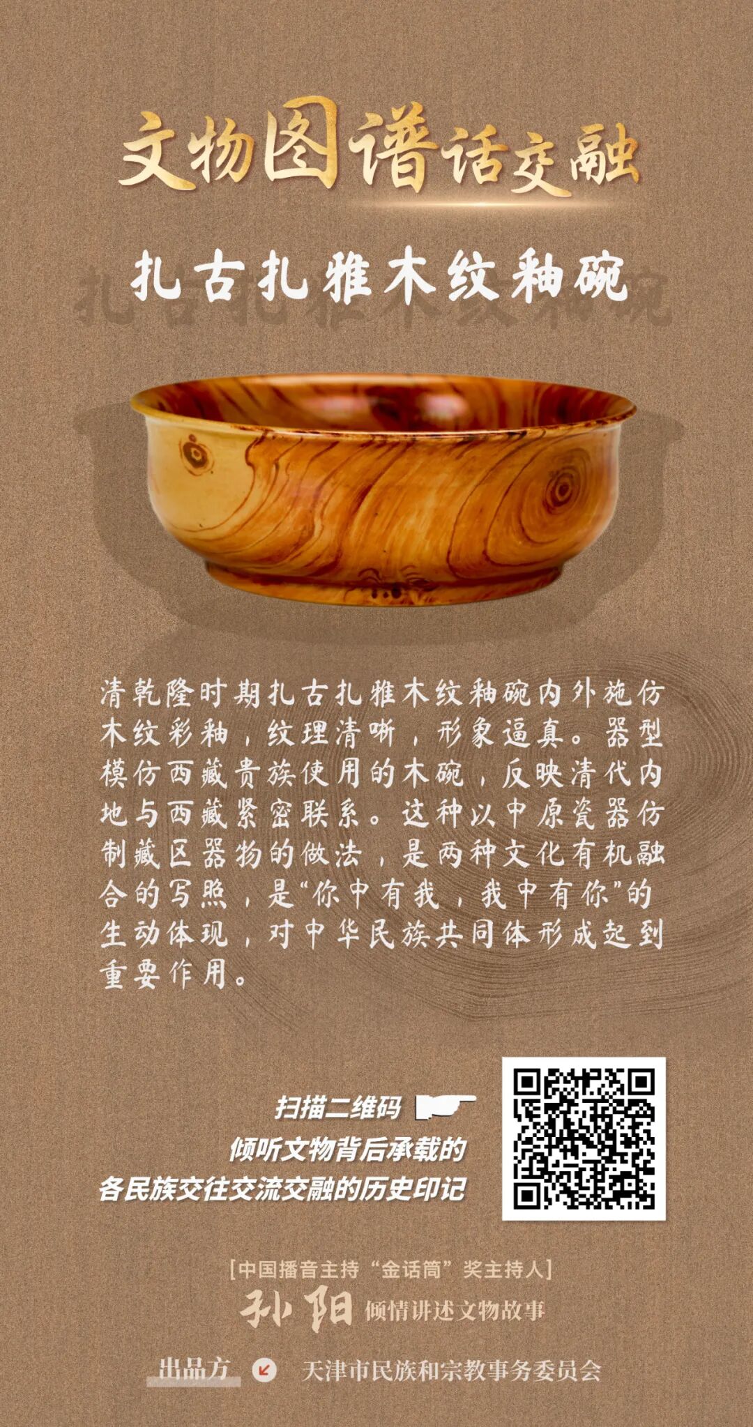 按:为进一步宣传贯彻落实习近平总书记关于加强和改进民族工作的重要思想以及习近平总书记视察天津重要讲话精神,牢牢把握新时代的文化使命,坚持以文化人、以文惠民、以文润城、以文兴业,在推动文化传承发展上善作善成,市民族宗教委紧紧把握铸牢中华民族共同体意识工作主线,从《中国民族文物图谱•天津市卷》中精选出珍贵文物,制作了23张“文物图谱话交融”为主题的有声海报,生动再现天津各民族广泛交往交流交融的历史故事。