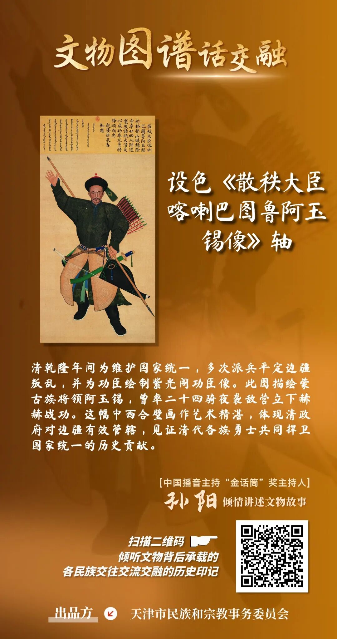 按:为进一步宣传贯彻落实习近平总书记关于加强和改进民族工作的重要思想以及习近平总书记视察天津重要讲话精神,牢牢把握新时代的文化使命,坚持以文化人、以文惠民、以文润城、以文兴业,在推动文化传承发展上善作善成,市民族宗教委紧紧把握铸牢中华民族共同体意识工作主线,从《中国民族文物图谱•天津市卷》中精选出珍贵文物,制作了23张“文物图谱话交融”为主题的有声海报,生动再现天津各民族广泛交往交流交融的历史故事。