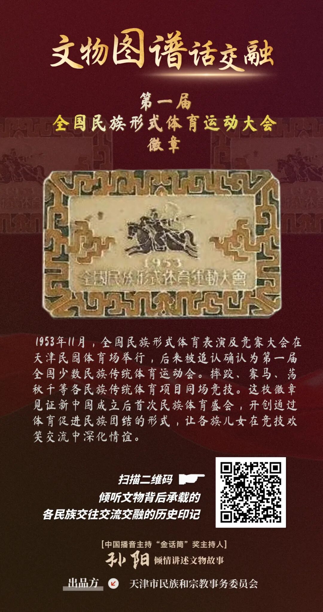 按:为进一步宣传贯彻落实习近平总书记关于加强和改进民族工作的重要思想以及习近平总书记视察天津重要讲话精神,牢牢把握新时代的文化使命,坚持以文化人、以文惠民、以文润城、以文兴业,在推动文化传承发展上善作善成,市民族宗教委紧紧把握铸牢中华民族共同体意识工作主线,从《中国民族文物图谱•天津市卷》中精选出珍贵文物,制作了23张“文物图谱话交融”为主题的有声海报,生动再现天津各民族广泛交往交流交融的历史故事。