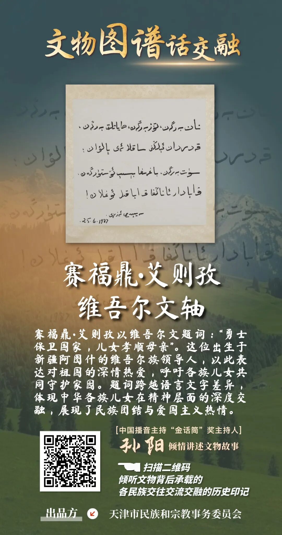 按:为进一步宣传贯彻落实习近平总书记关于加强和改进民族工作的重要思想以及习近平总书记视察天津重要讲话精神,牢牢把握新时代的文化使命,坚持以文化人、以文惠民、以文润城、以文兴业,在推动文化传承发展上善作善成,市民族宗教委紧紧把握铸牢中华民族共同体意识工作主线,从《中国民族文物图谱•天津市卷》中精选出珍贵文物,制作了23张“文物图谱话交融”为主题的有声海报,生动再现天津各民族广泛交往交流交融的历史故事。