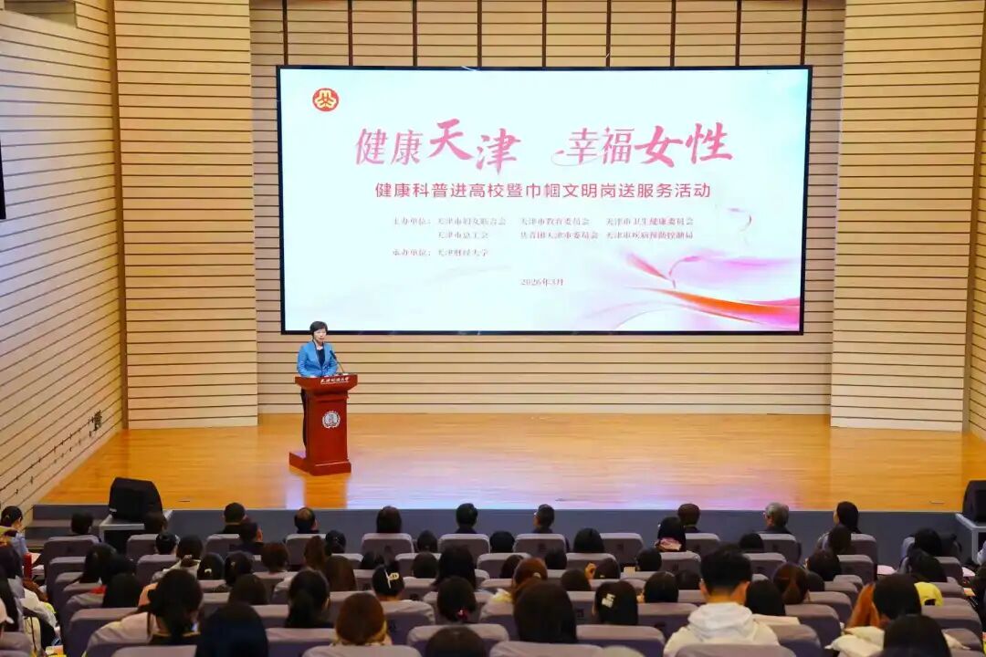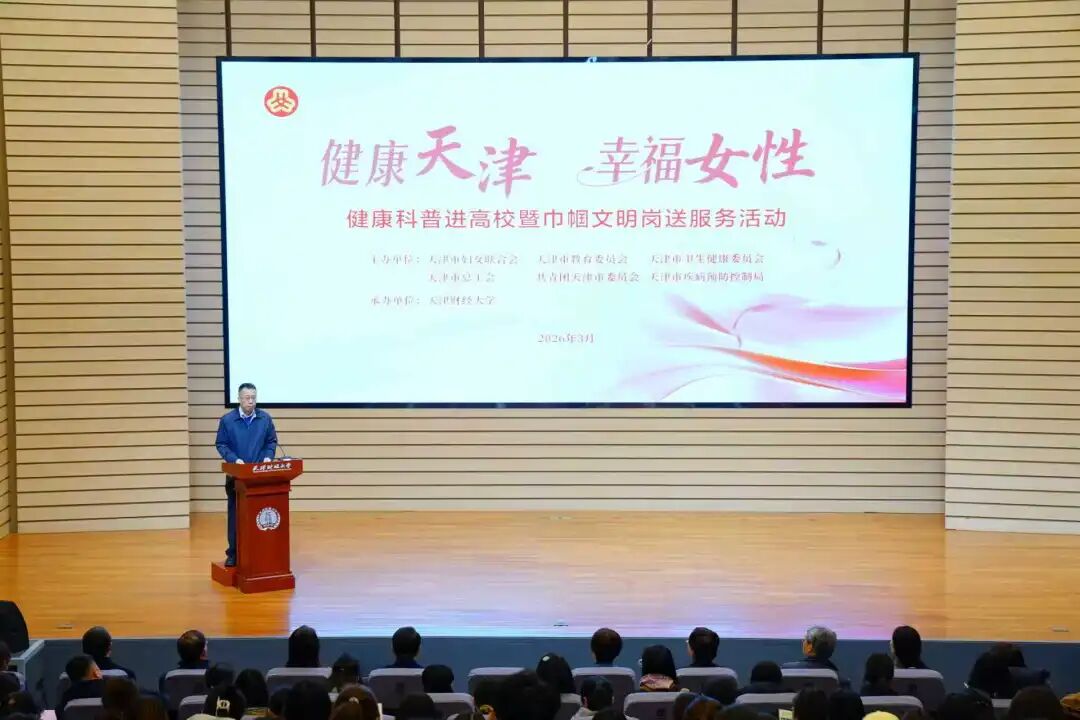 为深入贯彻健康中国战略和健康天津建设部署,落实《中国妇女发展纲要(2026-2030年)》要求,3月13日,由市妇联、市卫生健康委、市教委、市总工会、团市委、市疾控局六家单位共同主办,天津财经大学承办的“健康天津 幸福女性”健康科普进高校暨巾帼文明岗送服务首场活动,在财经大学顺利举办。市妇联党组成员、副主席于梅出席活动并致辞,市卫生健康委二级巡视员、宣传处处长孟欣,财经大学党委副书记马岩及各主办单位相关负责同志参加活动。